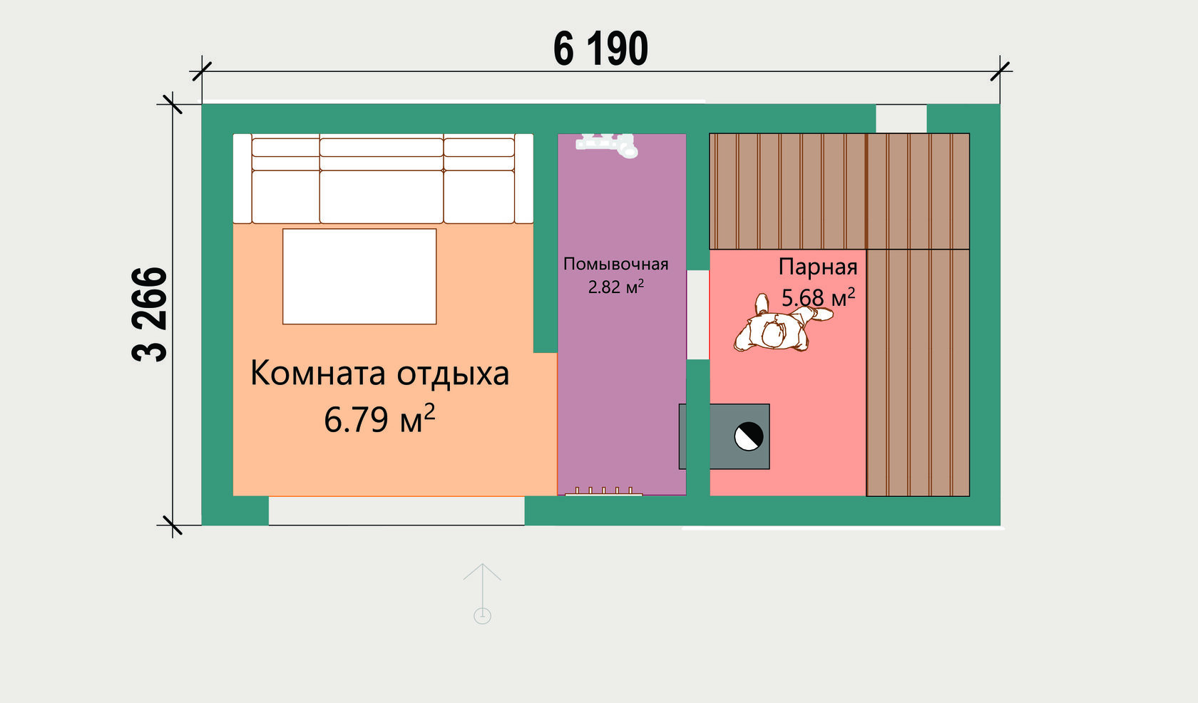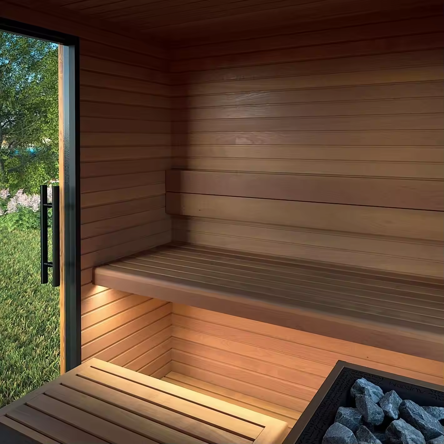 Заклад до 15 килограммов камня в закрытой каменке позволяет получать мелкодисперсный пар в режиме русской бани.